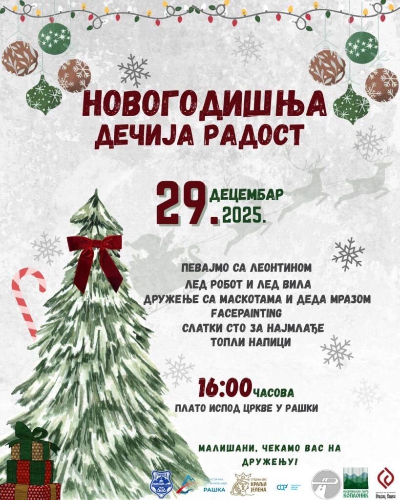 Општина Рашка организује новогодишњу манифестацију „Новогодишња дечја радост“, која ће бити одржана у понедељак, 29. децембра, са почетком у 16 часова, на платоу испред цркве у Рашки.